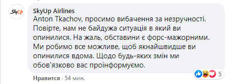 – Просимо вибачення за незручності. Повірте, нам небайдужа ситуація, в якій ви опинилися. На жаль, обставини є форс-мажорними. Щодо будь-яких змін ми обов’язково вас проінформуємо, – написали у коментарі під постом пасажира.