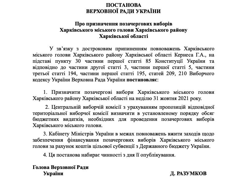 У Раді зареєстрували від Комітету державної влади та місцевого самоврядування проект постанови №5292 про призначення позачергових виборів харківського міського голови.