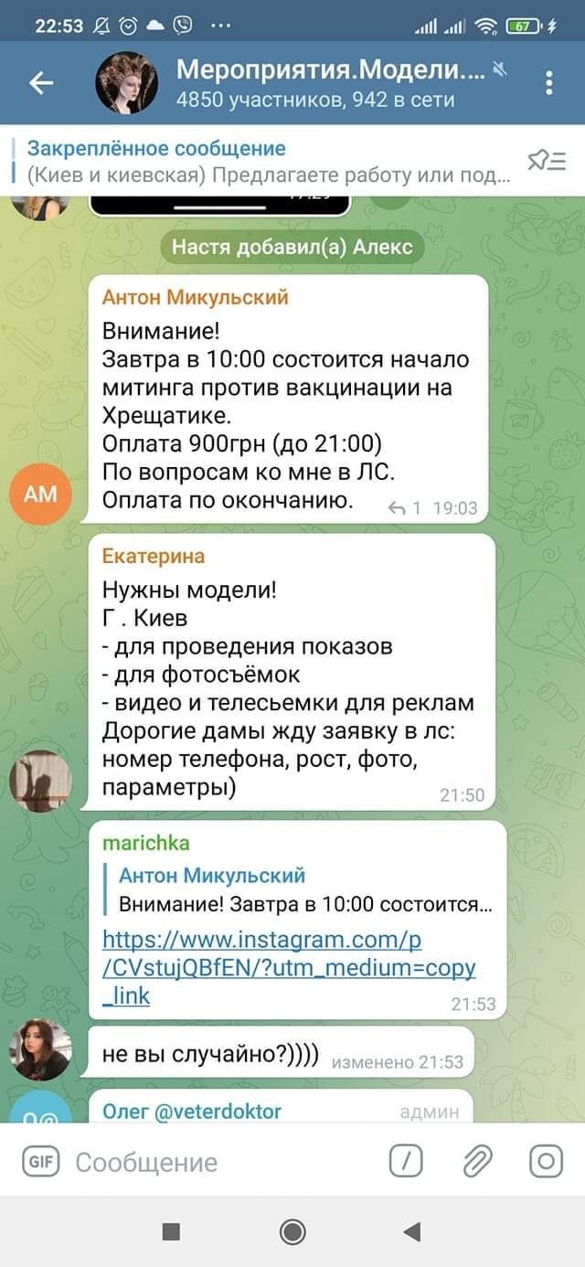 В одному зі столичних пабліків з пошуку короткострокового заробітку з’явилося оголошення про набір масовки на мітинг проти вакцинації. За участь у заході обіцяли гонорар у розмірі 900 грн.