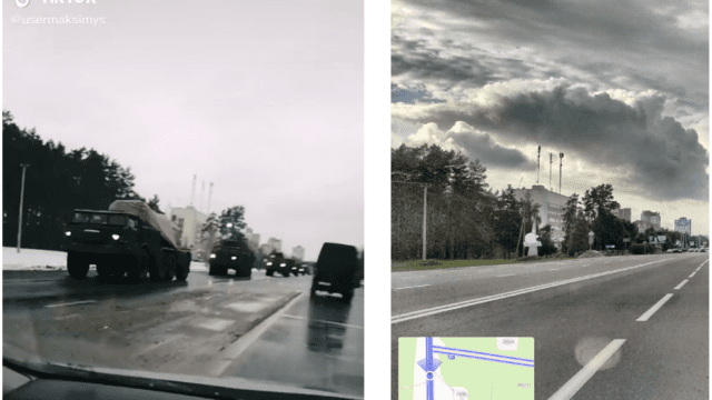 У білоруській столиці Мінську та її околицях також з’явилася російська техніка. На одному відео було показано поїзд, у якому містилися близько дюжини бойових машин піхоти БМП-2, вантажівки зв’язку та вантажівки загального призначення.
