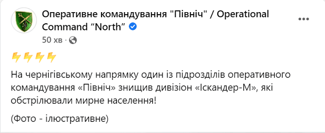 – На чернігівському напрямку один із підрозділів оперативного командування Північ знищив дивізіон Іскандер-М, які обстрілювали мирне населення, – йдеться у повідомленні.