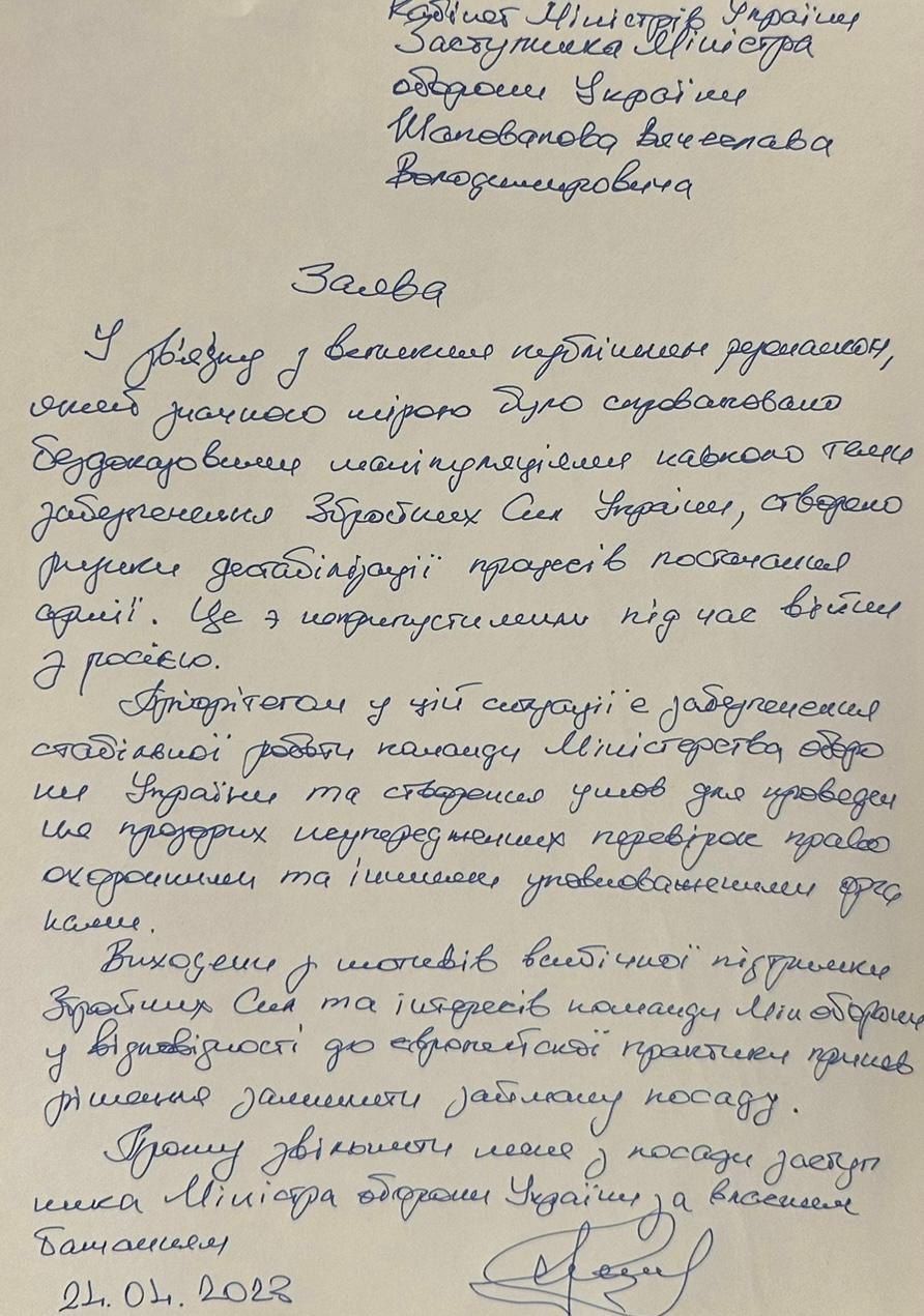 – В’ячеслав Шаповалов… попросив звільнити його, щоб не створювати загрози для стабільного забезпечення Збройних сил України внаслідок кампанії звинувачень, пов’язаних із закупкою послуг харчування.