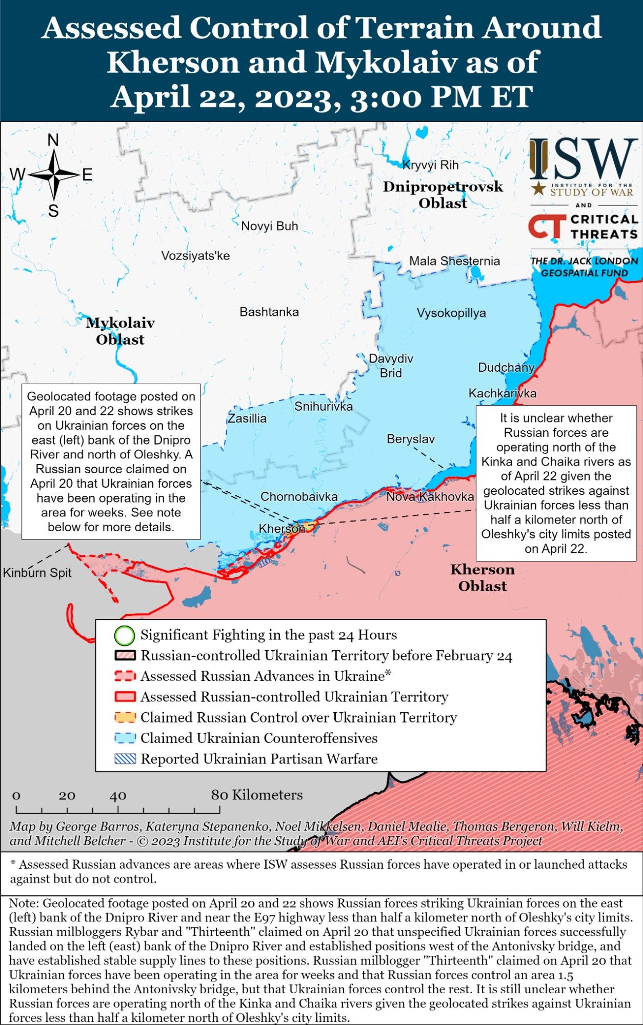 Згідно з геолокаційними кадрами росіян, Сили оборони перебувають на позиціях на березі Дніпра на північ від Олешок (7 км на південний захід від міста Херсона), просунулися до північної околиці населеного пункту на трасі E97, а також на захід від Дачі (10 км на південь від Херсону).