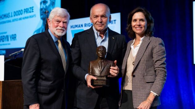 – Для мене велика честь – отримати від імені Меморіального центру Голокосту Бабин Яр Премію Томаса Дж. Додда з міжнародного правосуддя та прав людини. Я приймаю цю премію – від імені великої, чудової команди, переважно молодих українців, які працюють над створенням Меморіального центру Голокосту Бабин Яр. І від імені нашої країни України, яка прагне, щоби правду про Бабин Яр було розказано, — сказав Віктор Пінчук, приймаючи нагороду.