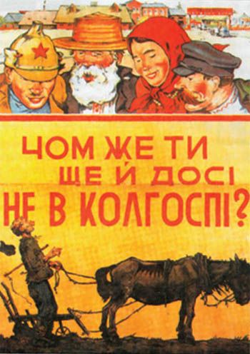 – Колективізація – процес об’єднання одноосібних селянських господарств у колективні. Колективізація в СРСР була переважно насильницькою, партійні діячі того періоду називали її сталінською “революцією згори”.