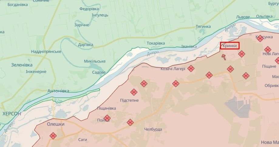 Американські фахівці, які моніторять ситуацію на фронті, помітили, що російські блогери наразі пишуть про бої в Кринках, що за 30 км на північний схід від Херсона та за 2 км від Дніпра.