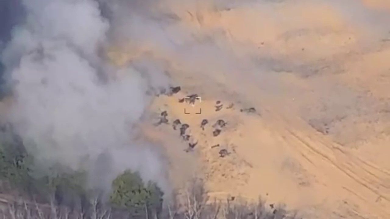 На відео можна побачити, як після вибуху всі окупанти, що стояли на полігоні, падають на землю.