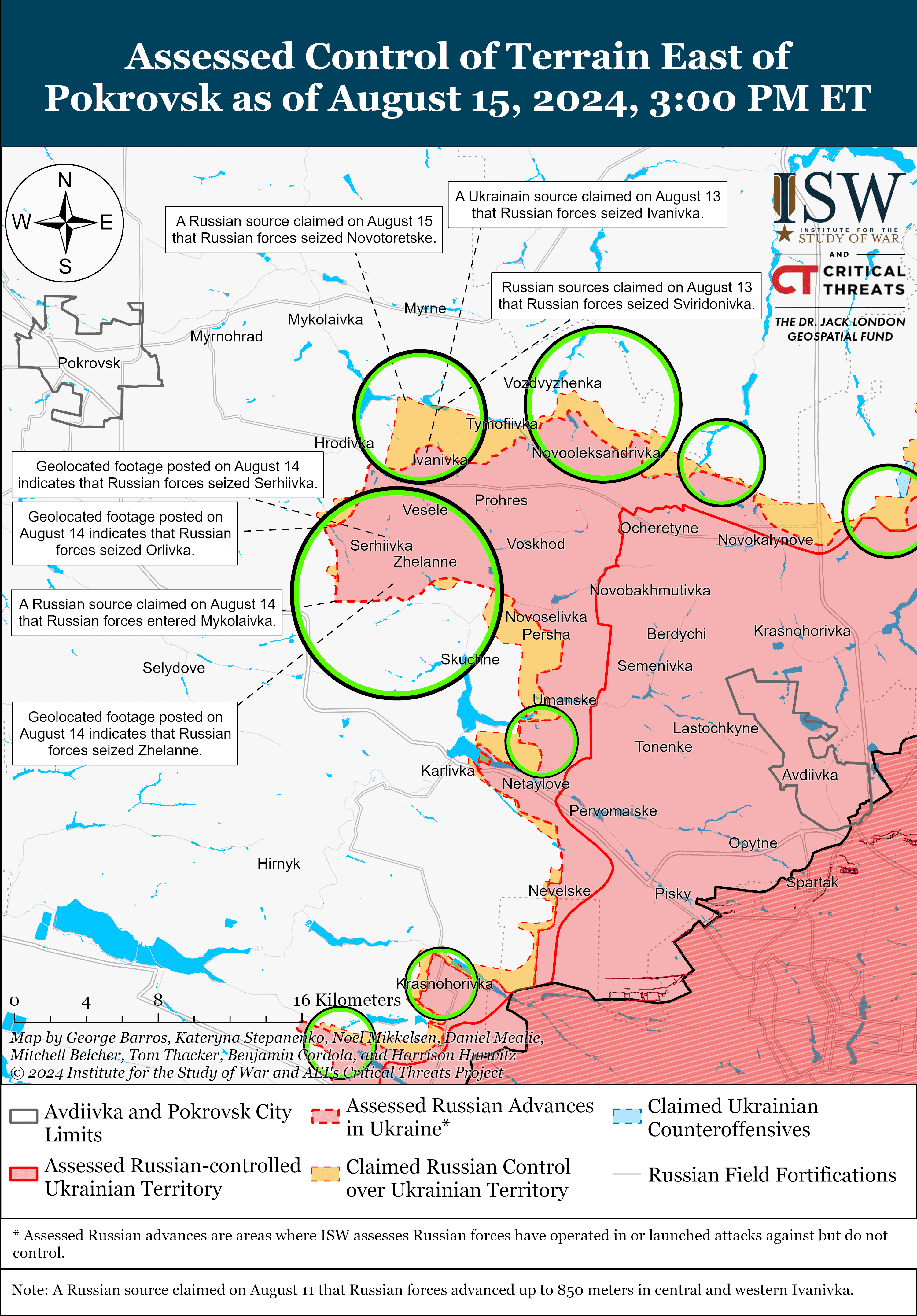 Зокрема, геолокаційні кадри від 14 та 15 серпня, зазначають в ISW, вказують на те, що російські війська нещодавно просунулися на схід від Покровська в межах Гродівки та на південний схід від Покровська в межах Миколаївки, Желанного та Орлівки.