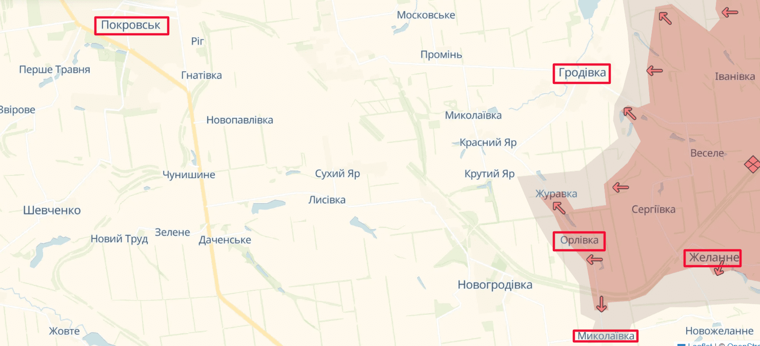 Покровськ, Гродівка, Миколаївка, Желанне, Орлівка на карті DeepState