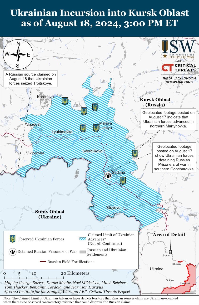 Бої в Курській області тривають. Станом на 18 серпня українські війська незначно просунулися на південний схід від міста Суджа.