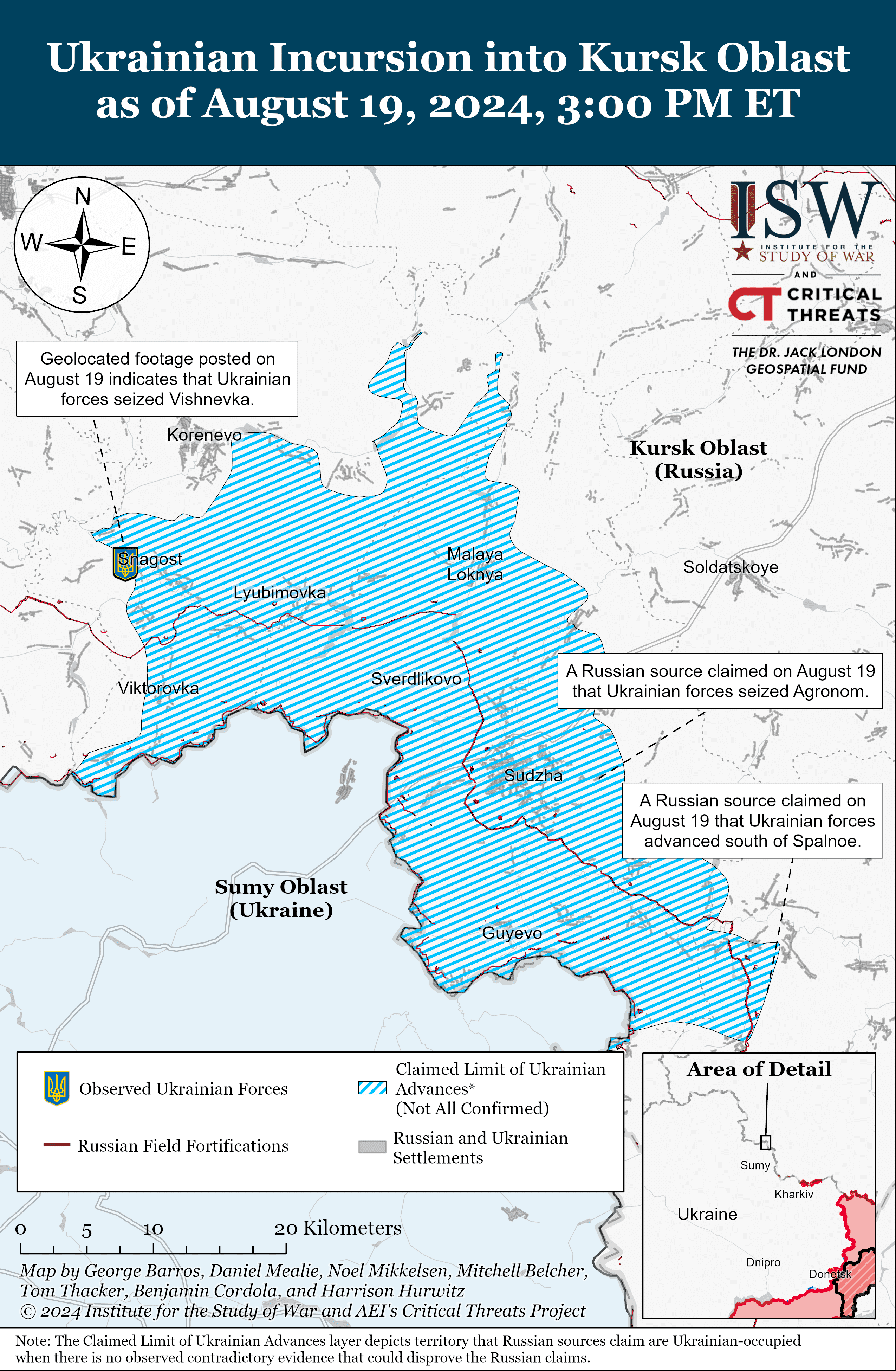 Зокрема, наголошують в ISW, геолокаційні кадри від 19 серпня свідчать, що українські сили просунулися у Вишневці, що на південний захід від Короневого та за 14 км від міжнародного кордону.