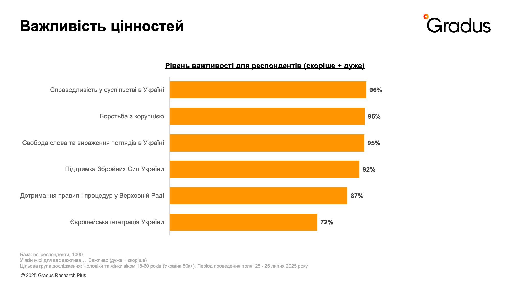 Основними орієнтирами для українського суспільства залишаються справедливість, боротьба з корупцією та свобода слова. Ці цінності важливими назвали понад 95% опитаних, незалежно від віку, статі чи регіону. Крім того, високий рівень важливості також мають підтримка ЗСУ (92%) та дотримання процедур у парламенті (87%). До системи суспільних пріоритетів також входить Європейська інтеграція України, хоч і дещо нижче у рейтингу (72%).