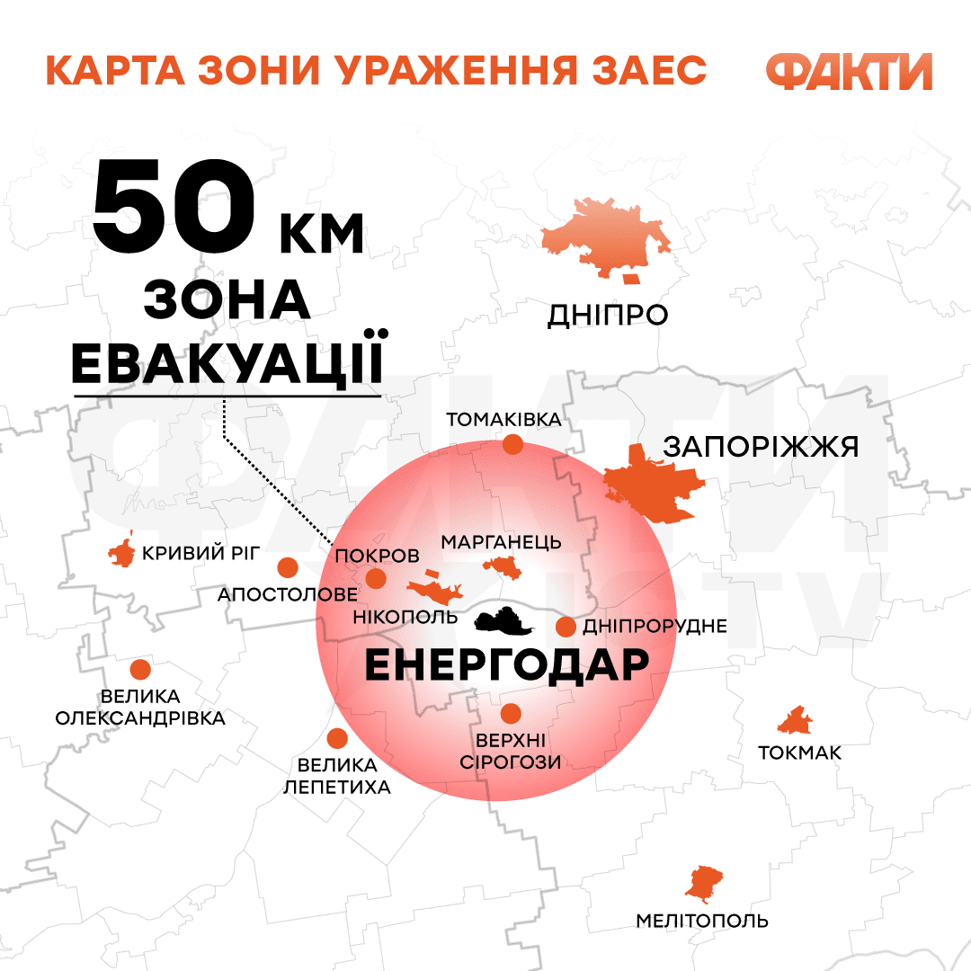 Потужність Запорізької АЕС становить 6 ГВт. До 50-кілометрової зони від міста Енергодар, біля якого розташована станція, належать такі населені пункти Запорізької області: