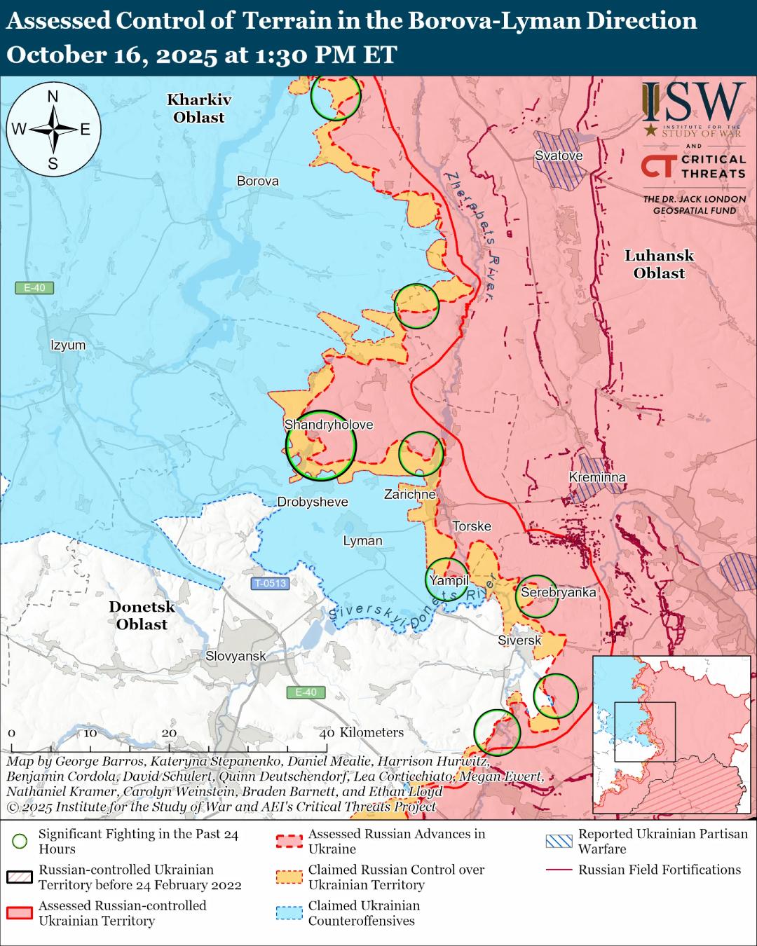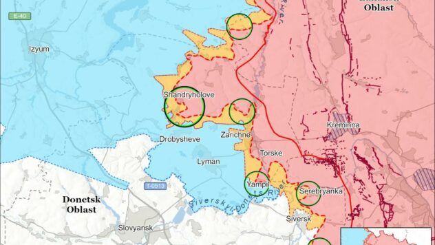 На Лиманському напрямку ворог атакував 11 разів, намагаючись просунутися вперед у районах населених пунктів Дерилове, Рідкодуб, Торське, Колодязі, Зарічне та в напрямках населених пунктів Дружелюбівка та Лиман.