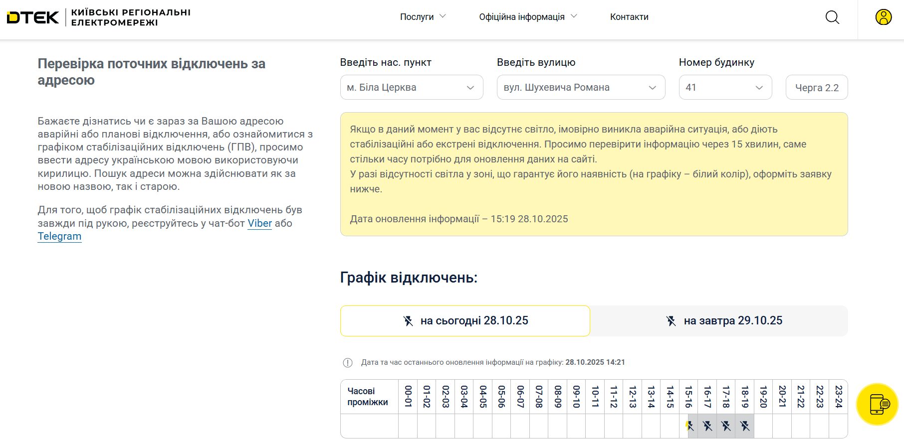 Нижче представлено детальний графік відключення світла у Білій Церкві на 28 жовтня: