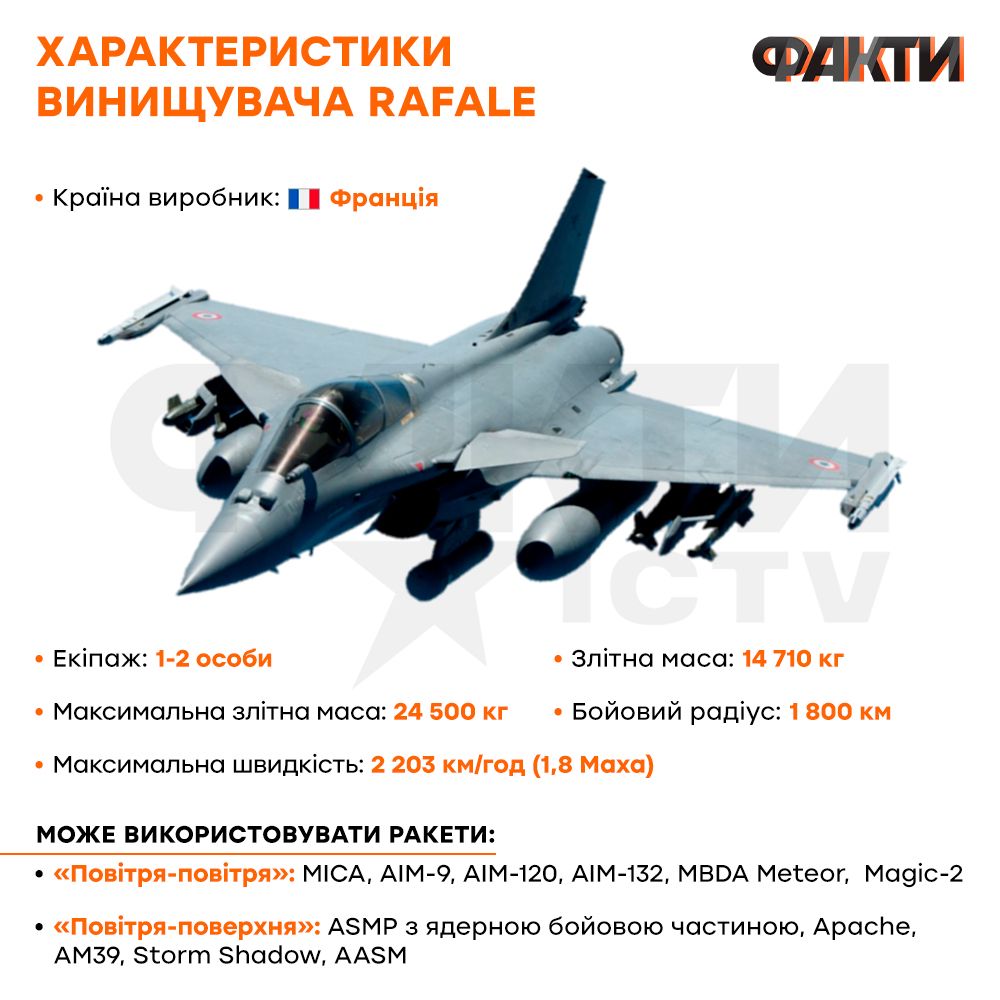 – За розміром та призначенням Rafale співмірний з радянським МіГ-29. Разом з тим має різний діапазон озброєння зразка НАТО. Це і використання різних ракет типу повітря-повітря або повітря-земля. Серед них і ракети, які Україні вже постачалися, наприклад AIM-9 або AIM-120, так і низка інших, які виготовляються безпосередньо Францією або іншими країнами НАТО. Може бути платформою для запуску крилатих ракет, наприклад, Storm Shadow, – пояснив експерт.