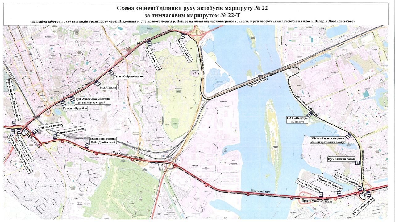 За інформацією Департаменту транспортної інфраструктури, автобуси №22 та №91 курсуватимуть за зміненими схемами під час повітряної тривоги та в разі запровадження Патрульною поліцією тимчасової заборони на рух транспорту Південним мостом із правого берега Дніпра на лівий.