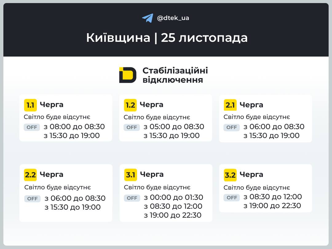 Компанія ДТЕК надала графіки відключення світла на Київщині 25 листопада.