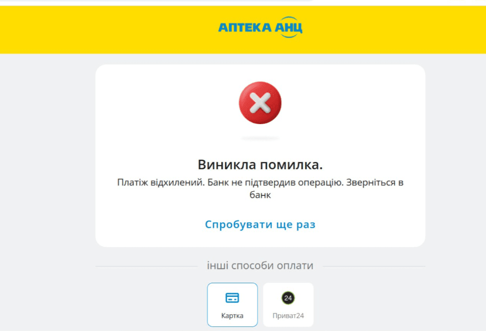 Далі спробували оплатити суші з доставкою в одній із відомих мереж японської кухні — і знову платіж не пройшов. Навіть у аптеці, коли ми вирішили придбати ліки, оплата не відбулася.