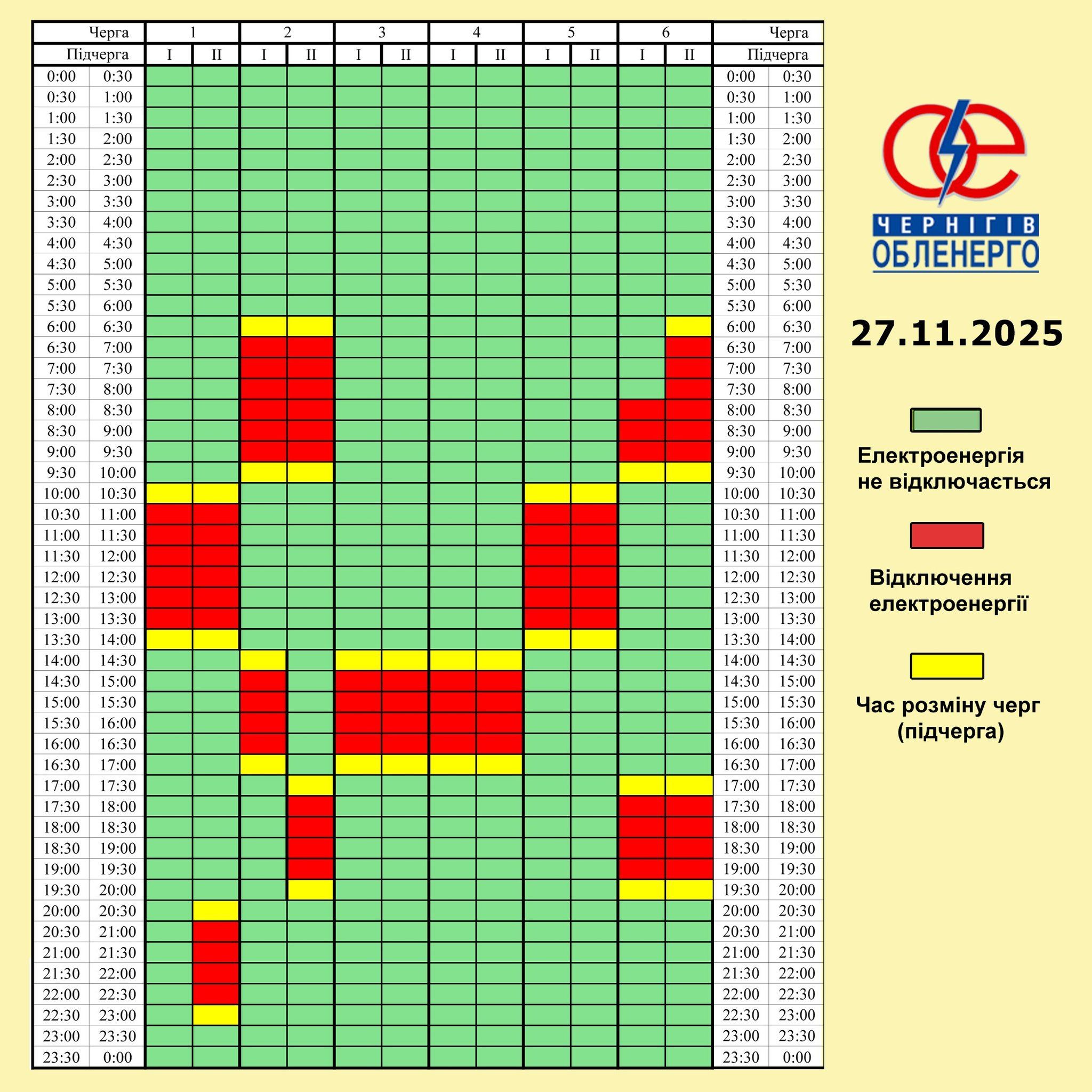 У Чернігові та Чернігівській області 27 листопада діятиме графік погодинних відключень, який оприлюднила компанія Чернігівобленерго.