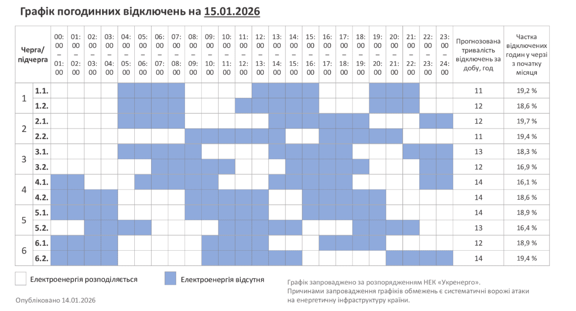 НЕК Укренерго повідомило про розширення обсягів обмежень електропостачання на четвер, 15 січня. Додатково вводиться ще одна підчерга в нічний період із 00:00 до 05:00.