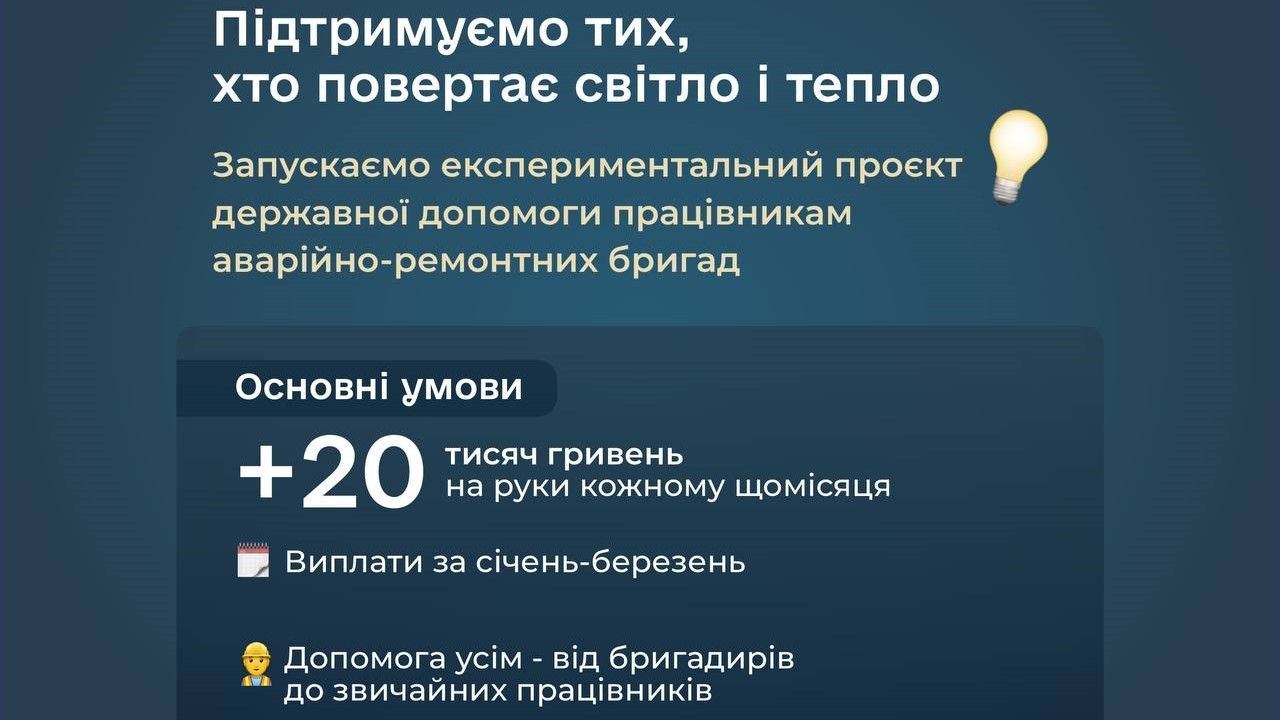 Кожен співробітник, залучений до аварійно-відновлювальних робіт, отримає доплату 20 тисяч гривень за січень, лютий і березень 2026 року.