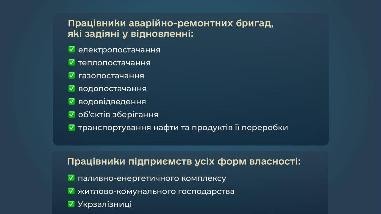 За словами Свириденко, йдеться про працівників енергетичних компаній, незалежно від форми власності, підприємств ЖКГ та Укрзалізниці, які безпосередньо залучені до аварійно-відновлювальних робіт.