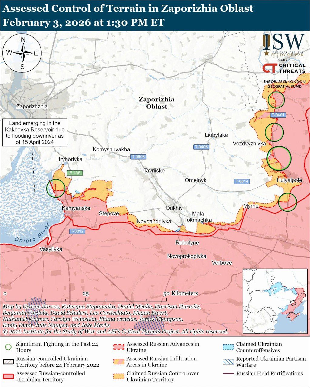 Протягом минулої добина фронті зафіксовано 153 бойових зіткнення. Ворог завдав ударів 72 ракетами та скинув 148 керованих авіаційних бомб. КАБи вдарили по населених пунктах, зокрема Долина, Зелена Долина Дніпропетровської області; Косівцеве, Єгорівка, Лугівське, Верхня Терса, Любецьке Запорізької області.
