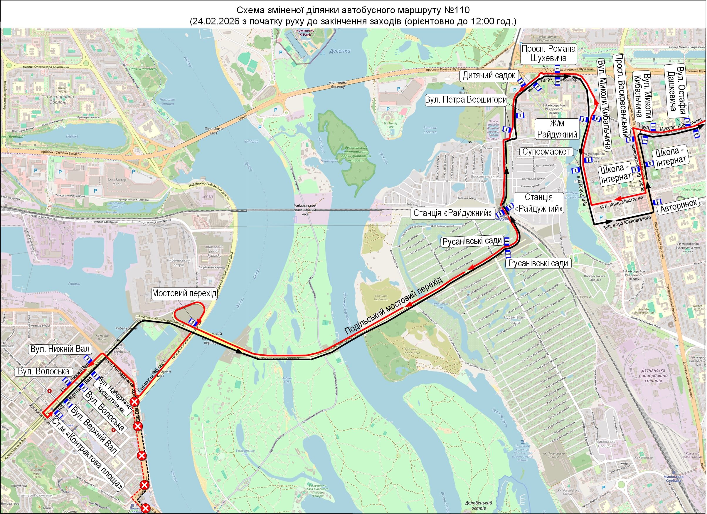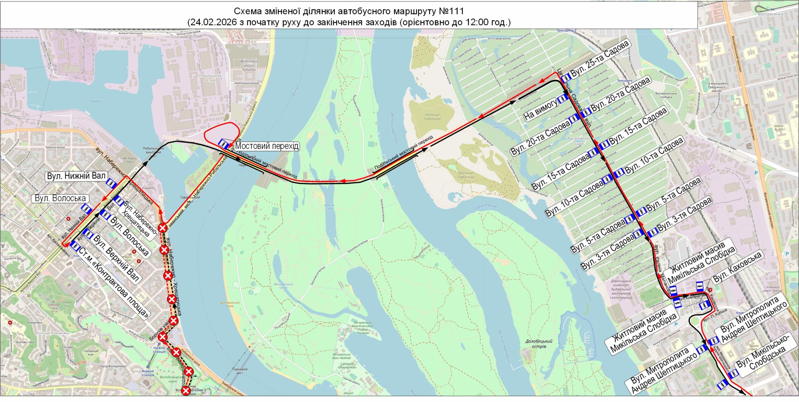- автобуси № 110 та № 111 – від вул. Милославської та Дарницької площі до Гаванського мосту за звичними маршрутами, далі – вул. Набережно-Хрещатицька, вул. Нижній Вал, вул. Костянтинівська, вул. Верхній Вал, станція метро Контрактова площа. У зворотному напрямку – вул. Верхній Вал – Подільський мостовий перехід – далі за звичними маршрутами (під номерами 110А та 111А, орієнтовно до 12:00);