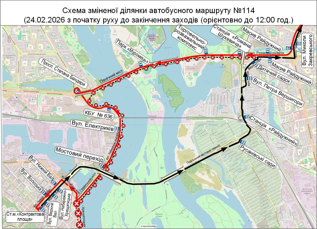 - автобуси № 114 – від вул. Милославської до Гаванського мосту за звичним маршрутом, далі – вул. Набережно-Хрещатицька, вул. Нижній Вал, вул. Костянтинівська, вул. Верхній Вал, ст. м. Контрактова площа. У зворотному напрямку – вул. Верхній Вал – Подільський мостовий перехід – вул. Петра Вершигори – просп. Романа Шухевича – просп. Червоної Калини – далі за звичним маршрутом (під номером 114А, орієнтовно до 12:00).