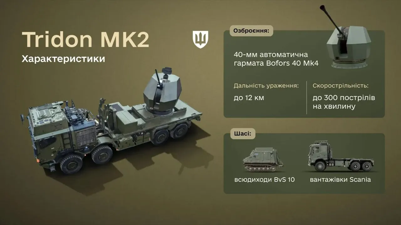 Як розповіли у Міноборони, система Tridon Mk2 оснащена 40-мм автоматичною гарматою Bofors 40 Mk4, здатною уражати цілі на дистанції до 12 км.
