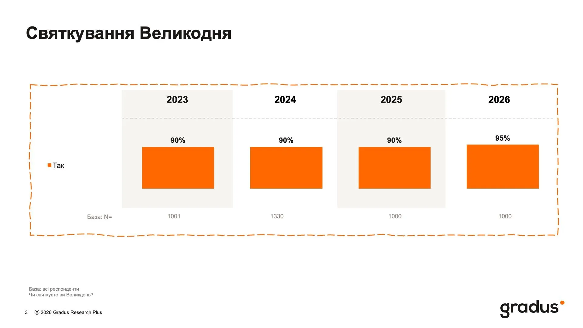 У результаті Великдень стає для багатьох українців емоційною традицією, набуваючи ролі спільного знаменника для суспільства, – прокоментувала результати дослідження соціологиня, засновниця і СЕО дослідницької компанії Gradus Євгенія Близнюк.