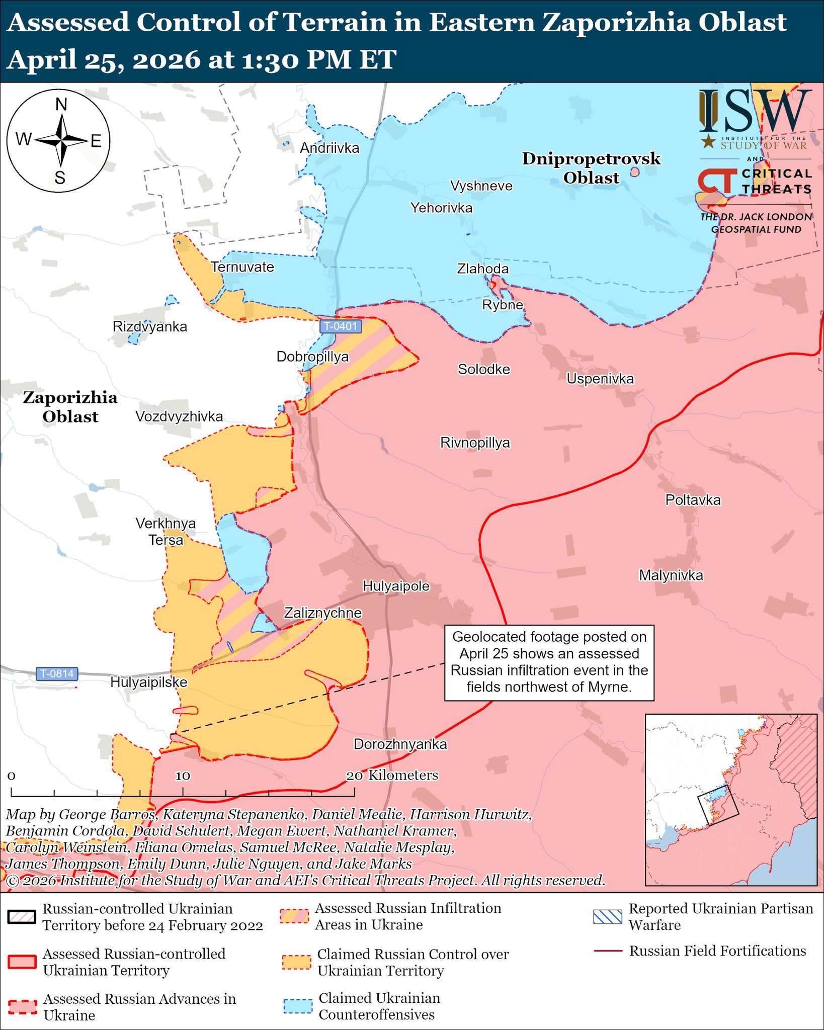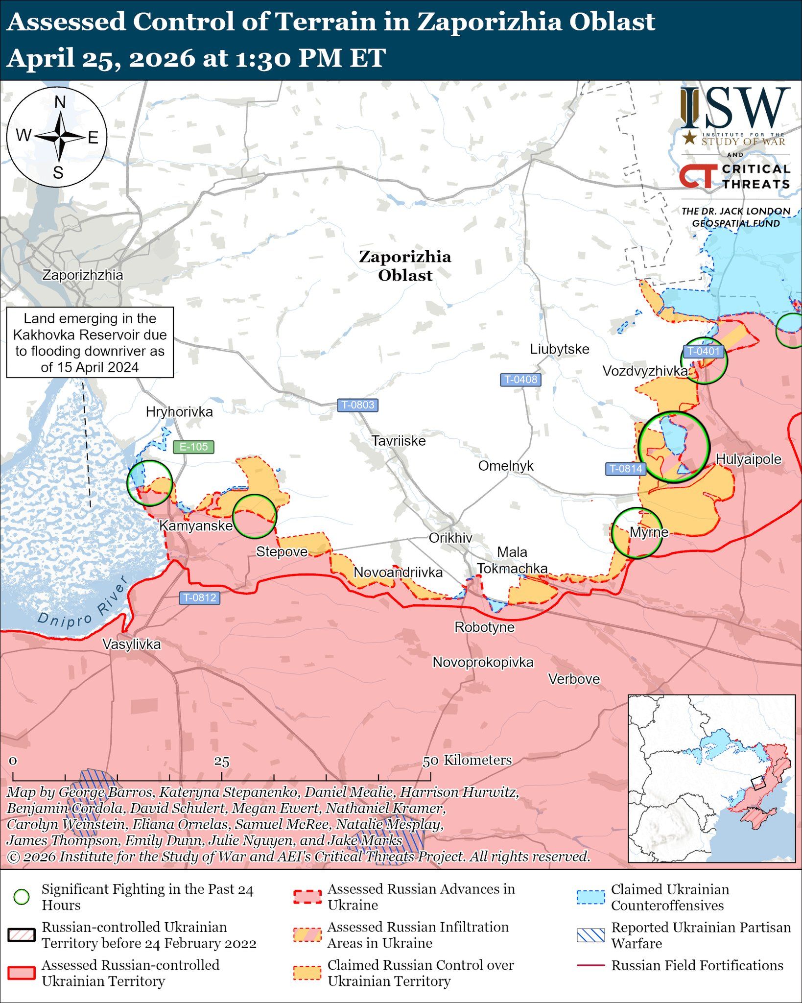 На Гуляйпільському напрямку відбулося 18 атак окупантів у районах населених пунктів Староукраїнка, Гуляйполе, Зелене, Святопетрівка, Гуляйпільське та Чарівне, а також у бік населених пунктів Копані та Новоселівка.