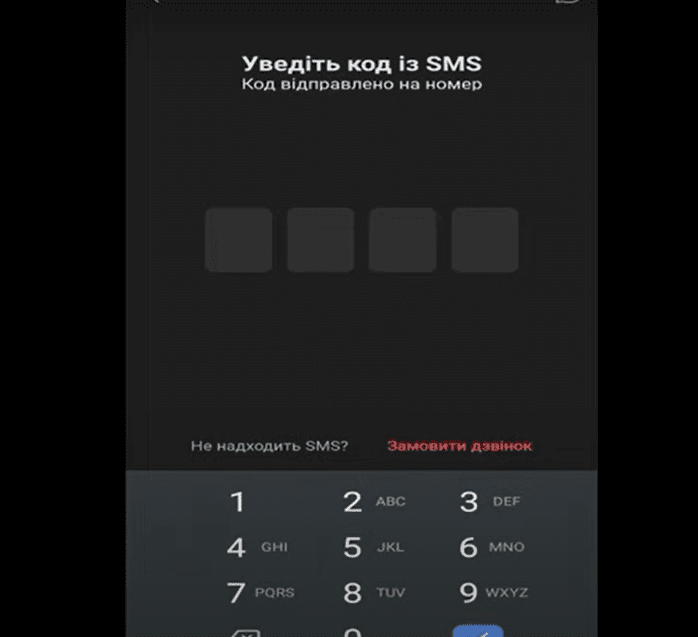 Передусім вказуємо свій номер телефону. Після чого вам прийде СМС із кодом підтвердження, який необхідно ввести у додатку.