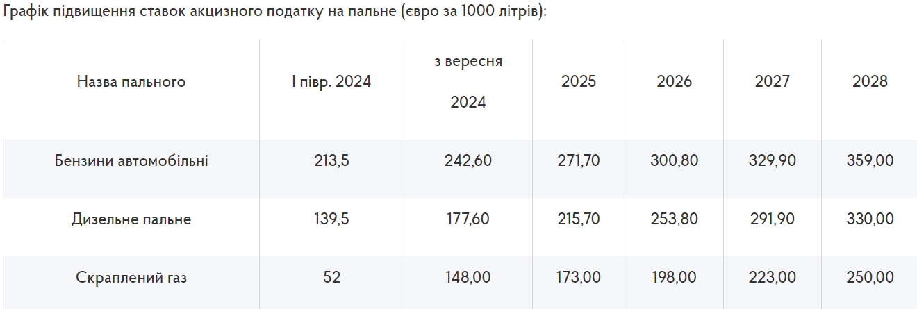 Ці ставки діятимуть до 31 грудня 2024 року включно, далі передбачено поступове підвищення акцизів на пальне протягом наступних чотирьох років – до 2028 року.