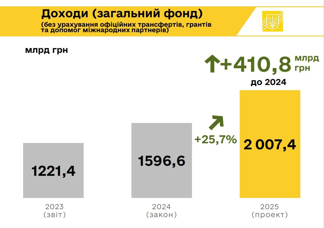 У Мінфіні зазначають, що доходи загального фонду держбюджету наступного року (без урахування офіційних трансфертів і грантів) передбачені на рівні 2007,4 млрд грн.