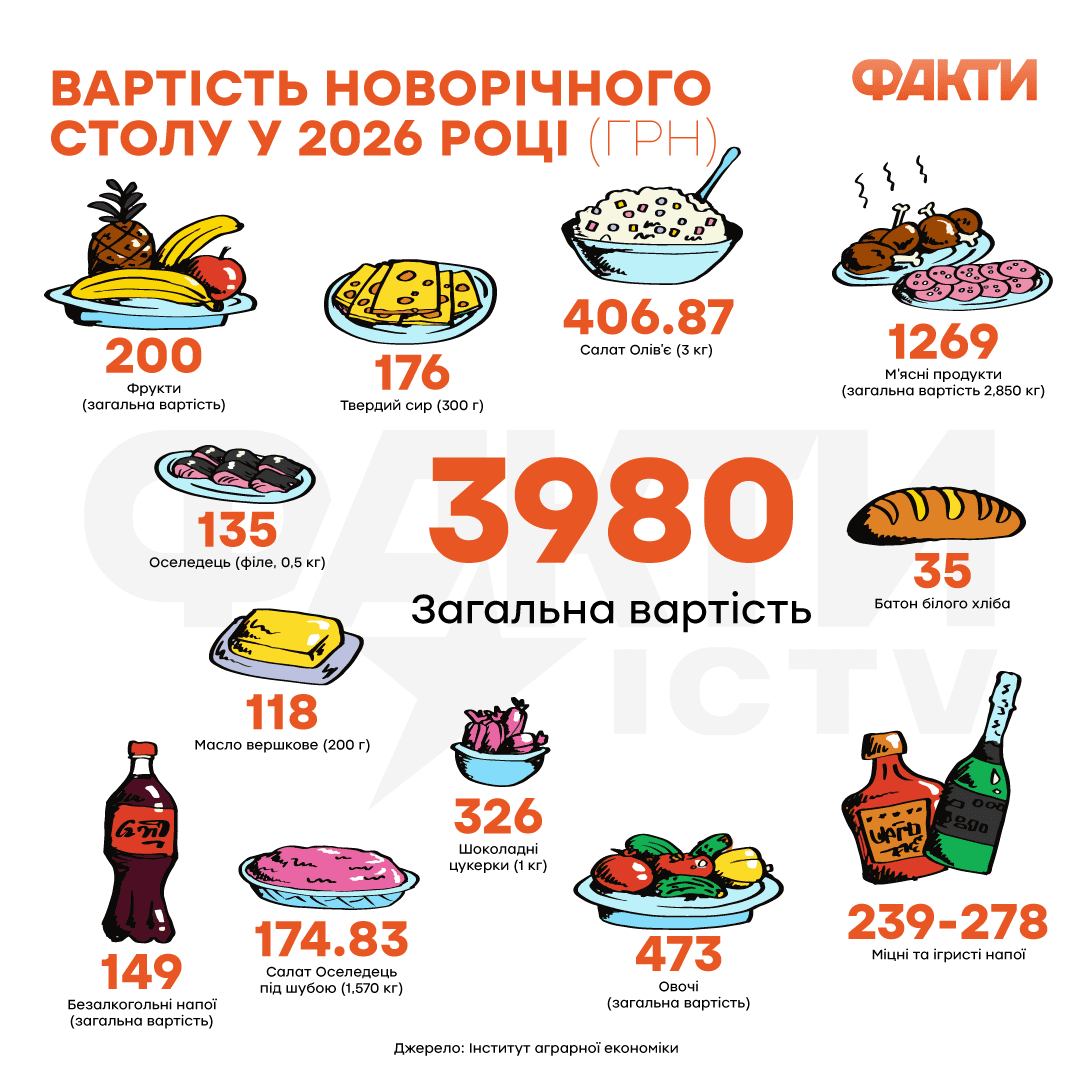 Фахівці Інституту аграрної економіки проаналізували, у скільки обійдеться новорічний стіл у 2026 році. Розрахунки зробили на основі середніх цін у супермаркетах станом на середину грудня 2025 року. За словами директора установи, академіка НААН Юрія Лупенка, традиційний набір страв для родини з чотирьох осіб коштуватиме близько 3 980 гривень. Це на 10,7% більше, ніж минулого року.
