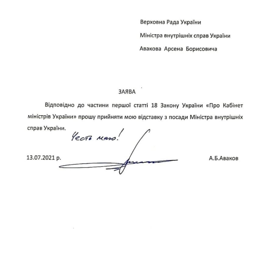 13 липня очільник МВС України Арсен Аваков подав у відставку. Відповідна заява з’явилась на сайті Міністерства внутрішніх справ.