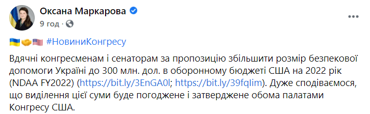 – Вдячні конгресменам і сенаторам за пропозицію збільшити розмір безпекової допомоги Україні до $300 млн в оборонному бюджеті США на 2022 рік. Дуже сподіваємося, що виділення цієї суми буде погоджене і затверджене обома палатами Конгресу США, – наголосила Маркарова.