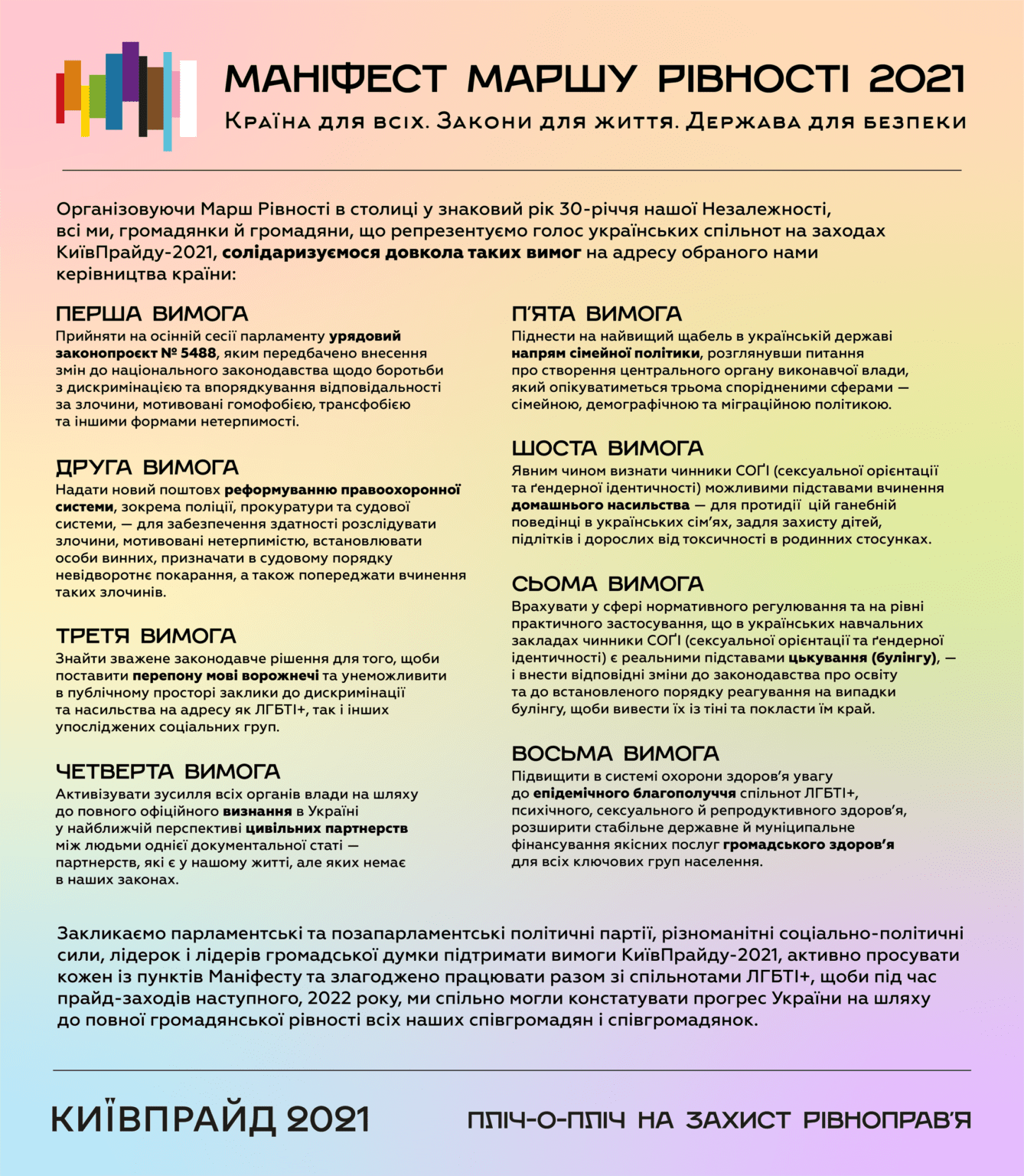Маніфест містить загалом 8 вимог до влади та суспільства: