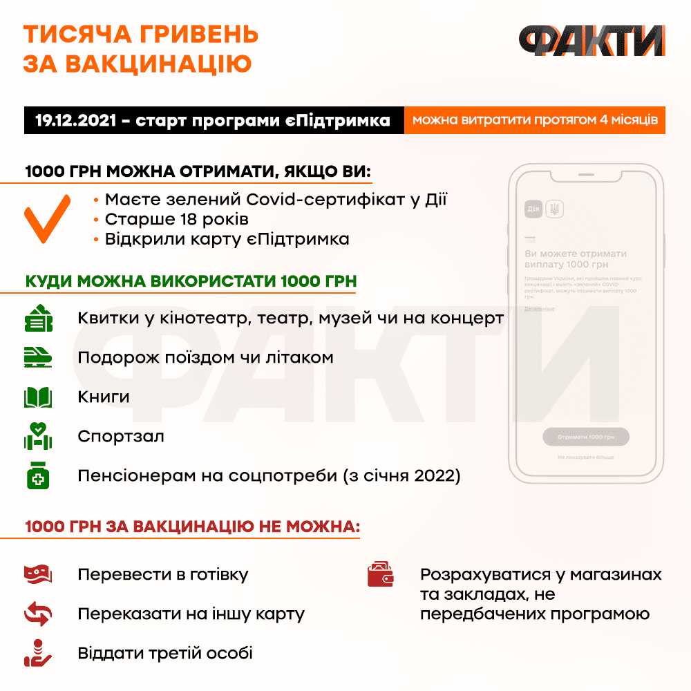 Витратити гроші за вакцинацію можна лише на території України. Після надіслання заявки на отримання коштів, українці матимуть можливість витратити 1 тис. грн протягом чотирьох місяців.