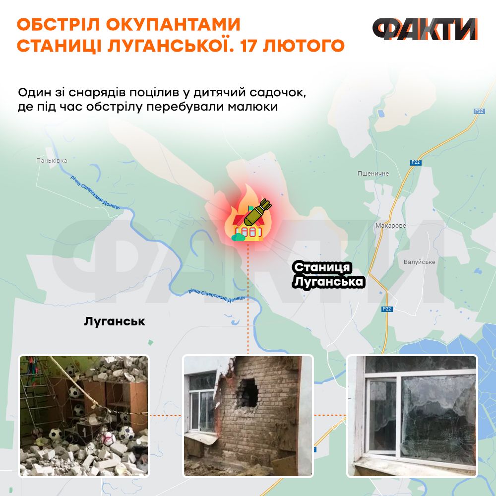 Під обстріли потрапив і дитячий садочок у Станиці Луганській, де постраждали троє працівників (сторож, прачка та помічниця вихователя). Про це повідомив глава Станично-Луганської селищної військово-цивільної адміністрації Альберт Зінченко.