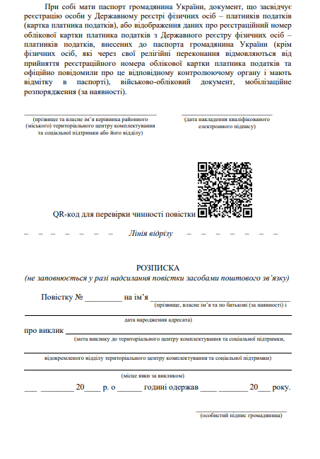 - Повістка для призову на військову службу (мобілізаційне розпорядження)
