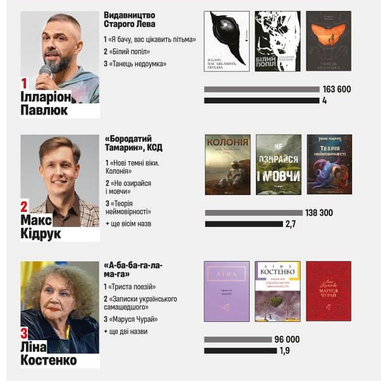 На другому місці – Макс Кідрук, що зокрема написав Колонію та отримав приблизно 2,7 млн грн. Третю позицію посіла Ліна Костенко з орієнтовними доходами у 1,9 млн грн.